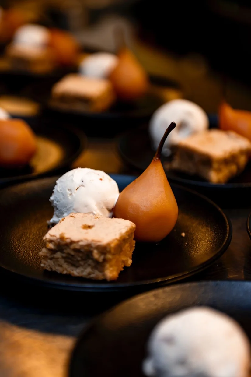 We schakelen over naar het hoofdgerecht: langzaam gegaard procureurvlees van Iberico met een crème van geroosterde venkel, pijnboompitten en een vinaigrette van serranoham. In het glas een rode wijn van Spaans wijnwonderkind Telmo Rodriguez. Gaba 2021 is gemaakt van de mencíadruif en komt uit Valdeorras, het koele klimaat van Galicië.