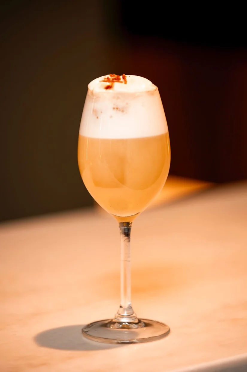 De enige sherrybar van Nederland (Destino dus) pakt de uitdaging al bij de cocktail op: Licor 43 Serrano Sour, met schuim en poeder van Consorcio Serrano-ham. En stiekem ook nog een drupje sherry.