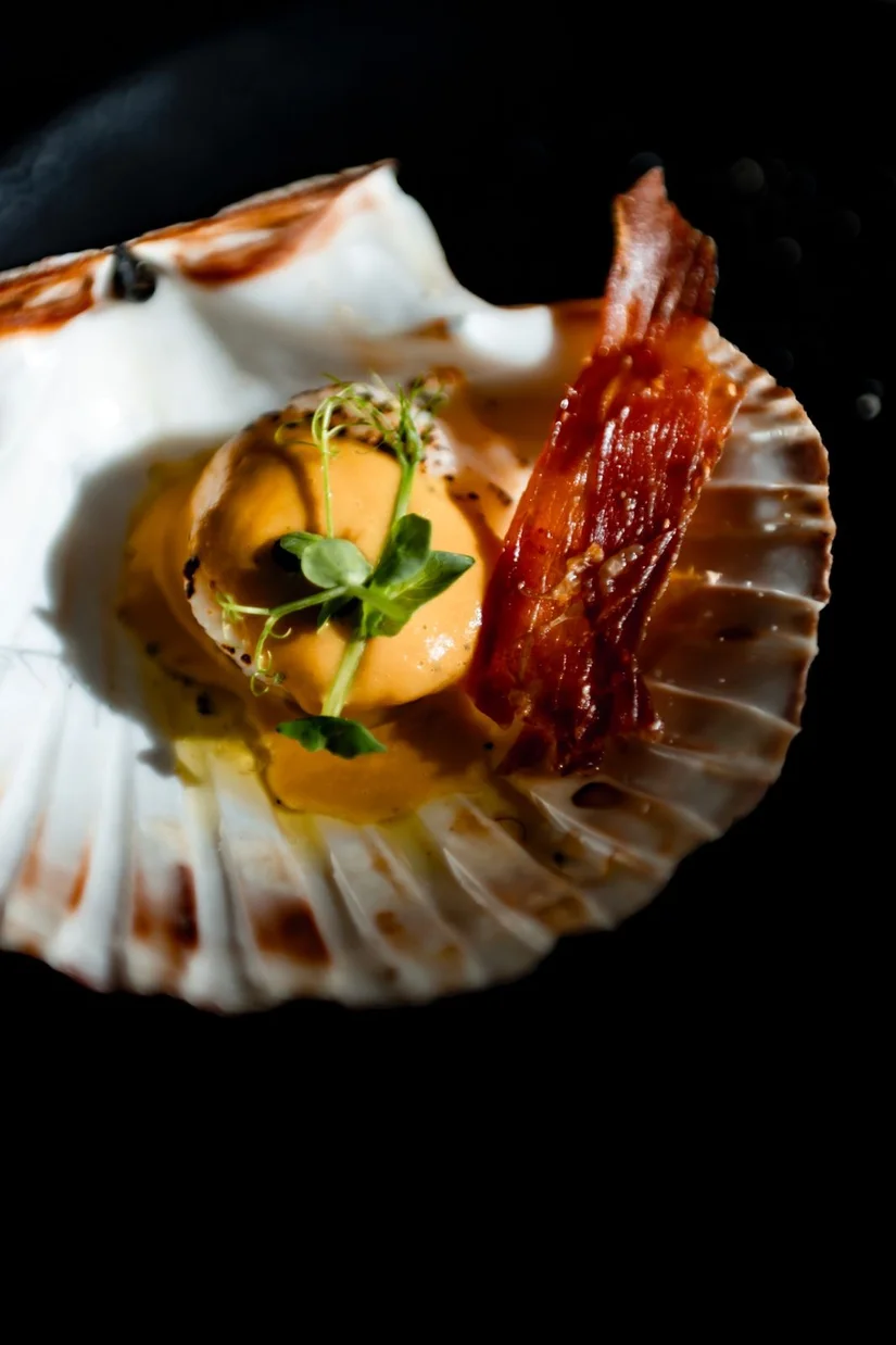 Op tafel verschijnt een fraai opgemaakt schelp, erop een verse coquille vermomd als eidooier met krokante serranoham in een licht-pittige pompoensaus. Gecontroleerd zilt, aards en notig. Zo’n gerechtje dat je het liefst tot de laatste druppel oplikt of met een broodje opveegt. We kiezen voor het laatste.