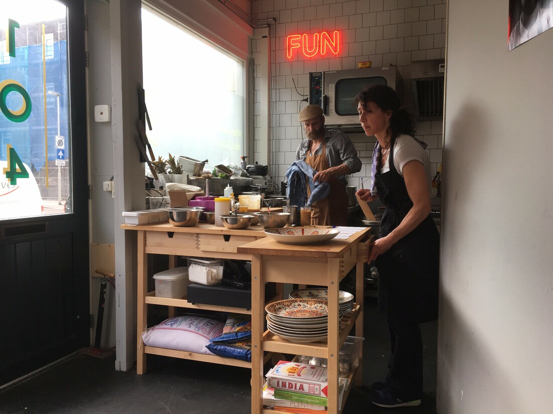 Een onderhoudend praatje met je buren is snel gemaakt. Je kunt je mond natuurlijk ook alleen openen om de uitstekende gerechten van DJ naar binnen te steken. Op de tafel verschijnt een trits aan Indiase traktaties, de meeste overigens veganistisch. Van gefermenteerde rijstpannenkoeken en vlijmscherpe chutneys tot romige kokosdesserts en kip uit de tandooroven.