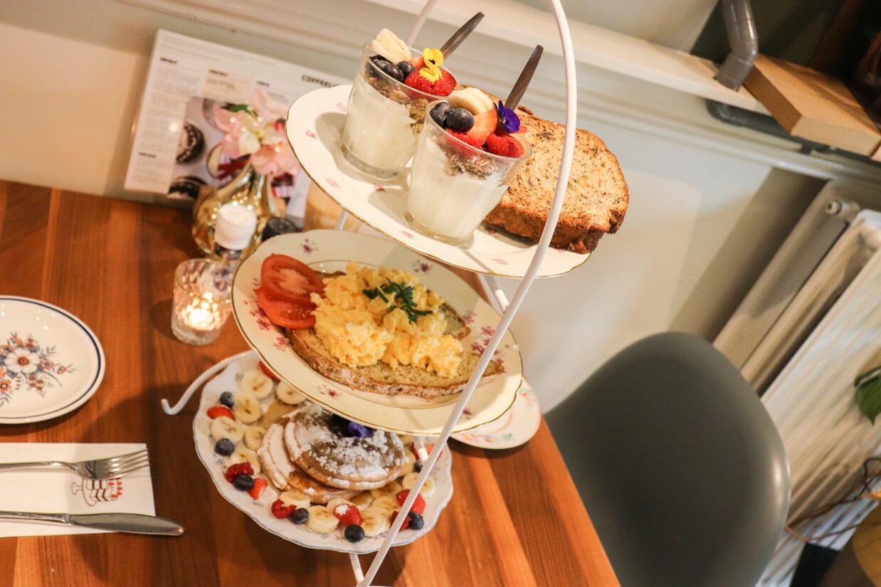 De brunch wordt geserveerd op een etagère met op elk bord lekkers waar je direct op wilt aanvallen. Zo bestaat deze brunch bij Coffeelicious uit het volgende: Griekse yoghurt met huisgemaakte granola en vers fruit, huisgemaakt bananenbrood met roomboter, huisgemaakt sodabrood met scrambled eggs en pancakes met vers fruit en maple syrup. Daarbij kun je een koffie, (verse) thee, cappuccino of latte naar keuze bestellen.