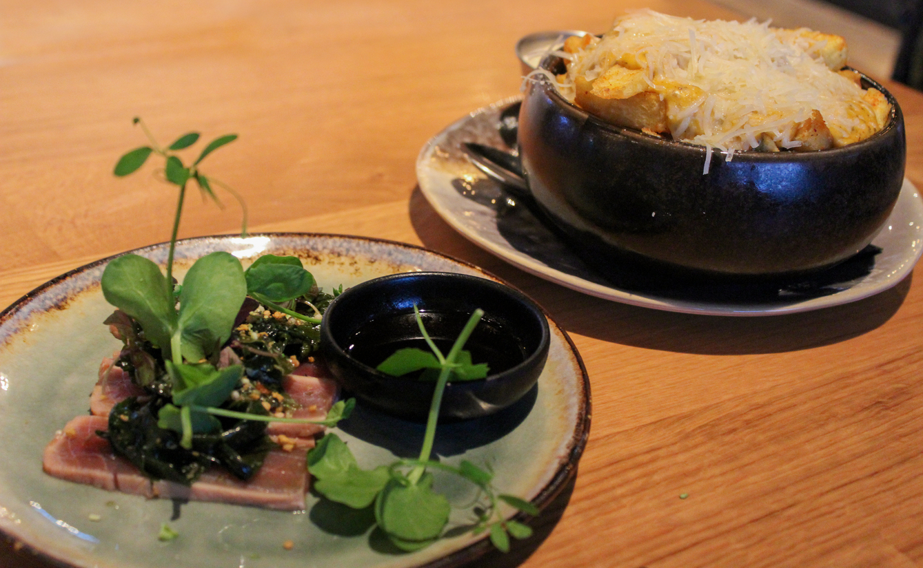 De borrelplank los is net niet genoeg voor twee personen als diner, dus we kijken nog eens op de borrelkaart en bestellen er nog een losse tonijn tataki en een frietje met Parmezaan en truffelmayonaise bij. Die laatste blijkt een goede keuze om de laatste trek te stillen, want hoewel we een frietje met een beetje Parmezaan verwachtten, blijkt het bakje friet echt loaded te zijn met Parmezaan en een erg lekker kaassausje. De tonijn tataki met een frisse zeewiersalade en sojasaus is hiermee goed in balans, een fijn licht gerecht voor bij de zwaardere frietjes.