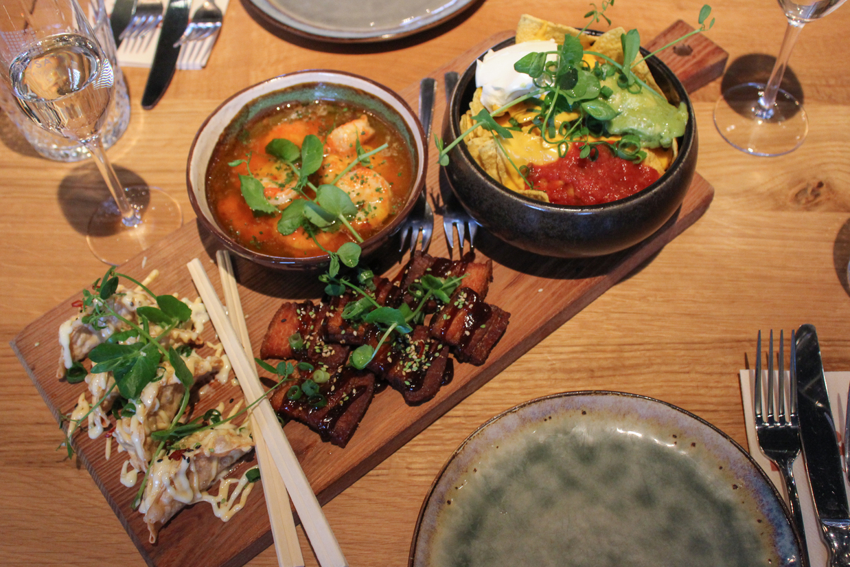 Met keuze uit gevarieerde simpele en luxere dinergerechten, van een saté tot carpaccio van langoustine, en veel verschillende borrelhappen besluiten we vandaag aan de borrel te gaan. Er is keuze uit frituurhapjes maar ook uit luxere losse kleine gerechtjes en zelfs hele charcuterieborden. We vangen aan met een glaasje bubbels en daarbij wordt ons de ‘Mullers choice’ aangeraden, een verrassingsborrelplank met een aantal favorieten van de chef, die je ook als losse hapjes kunt bestellen. Deze borrelplank bestaat uit gyoza’s met gamba en srirachamayonaise, gamba’s pil pil in olie met knoflook en rode peper en een bakje nacho’s, goed beladen met kaassaus, creme fraiche, guacamole en tomatensalsa. De sticky buikspek met hoisin en bosui die erbij zit is onze favoriet: heerlijk knapperig en met een perfecte hoeveelheid saus.