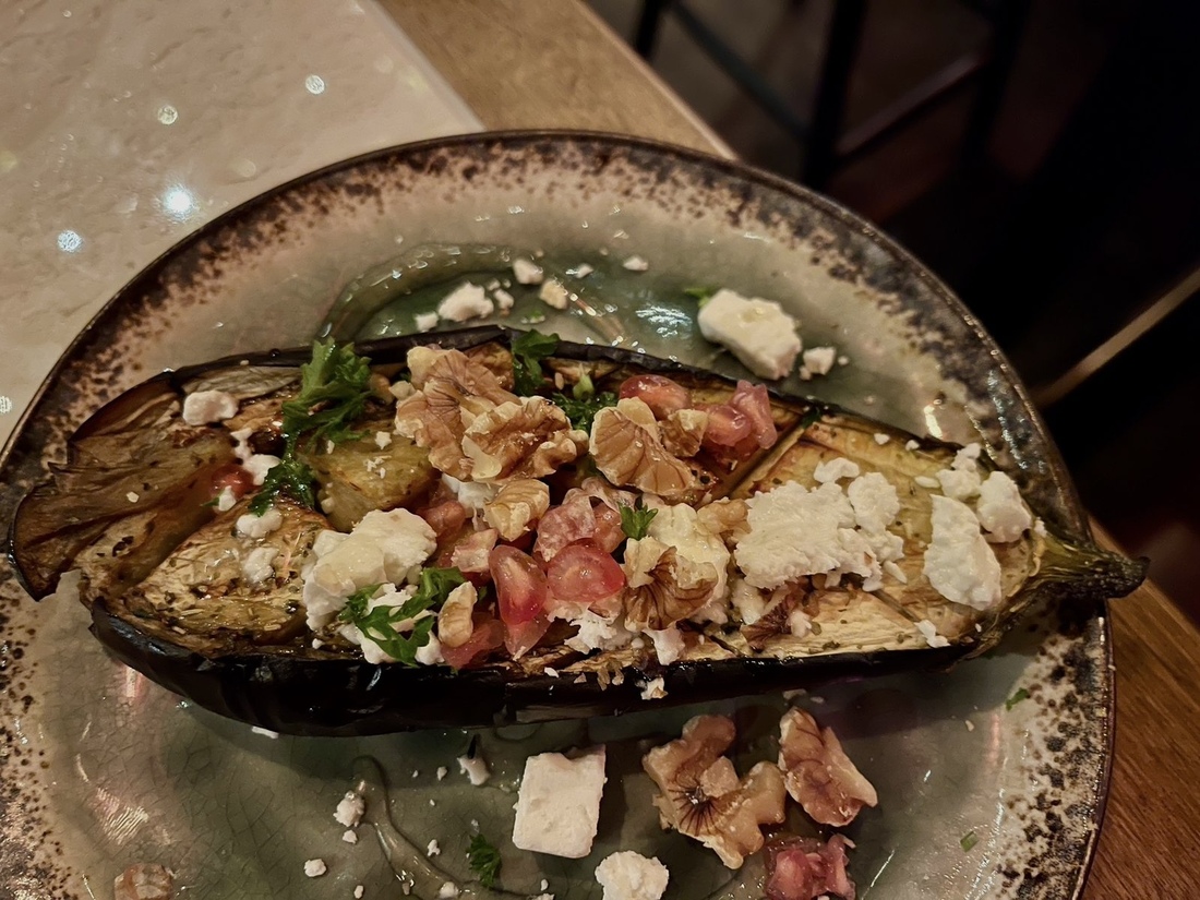 De berenjena, ofwel aubergine in het Nederlands, is gegrild en overgoten met honing en verkruimelde feta. Een fijne combinatie van zoet en zout. De stukjes walnoot zorgen voor een knapperige bite.