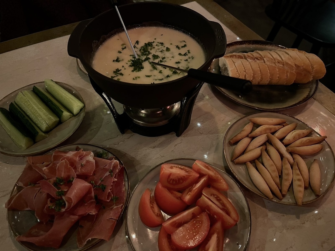 De pan kaasfondue wordt aangevuld met een uitgebreid assortiment aan dippers. Er is brood, komkommer en tomaat, maar ook hier is er een Spaans accent toegevoegd in de vorm van chorizo en serranoham, maar de gehaktballetjes zijn de ster van de show. Sappig, kruidig en in combinatie met de kaas een echte smaakexplosie.