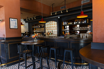 Binnen bij Bar Pepito voelt het alsof je een tapasbar in Madrid binnenstapt. De warme oranje tinten, bakstenen muren en hoge tafels zorgen voor een levendige, maar knusse sfeer. De donkerblauwe bar vormt een stijlvol contrast en trekt direct de aandacht, met haar halfronde bogen en de naam Pepito in mozaïek ingelegd.