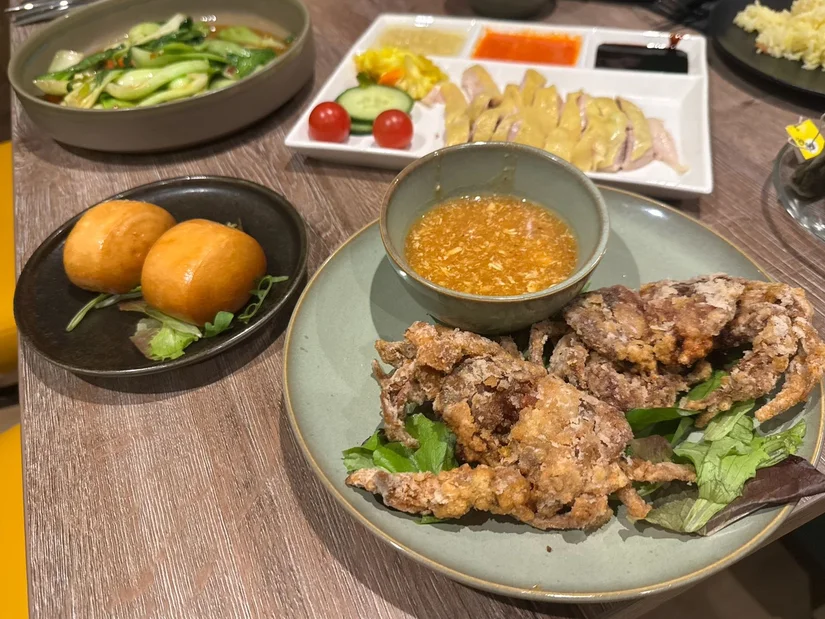 Als eerste verschijnt de Hainanese chicken rice op tafel. Dit gerecht wordt in Singapore vaak gezien als ‘nationaal erfgoed’. De kip is gepocheerd en wordt geserveerd met rijst die gekookt is in geurige kippenbouillon. Daarbij worden drie sauzen geserveerd: een frisse gember-lente-ui saus, zoete, donkere sojasaus en een chilisaus. Alles op kamertemperatuur, zoals traditioneel gezien de bedoeling is.