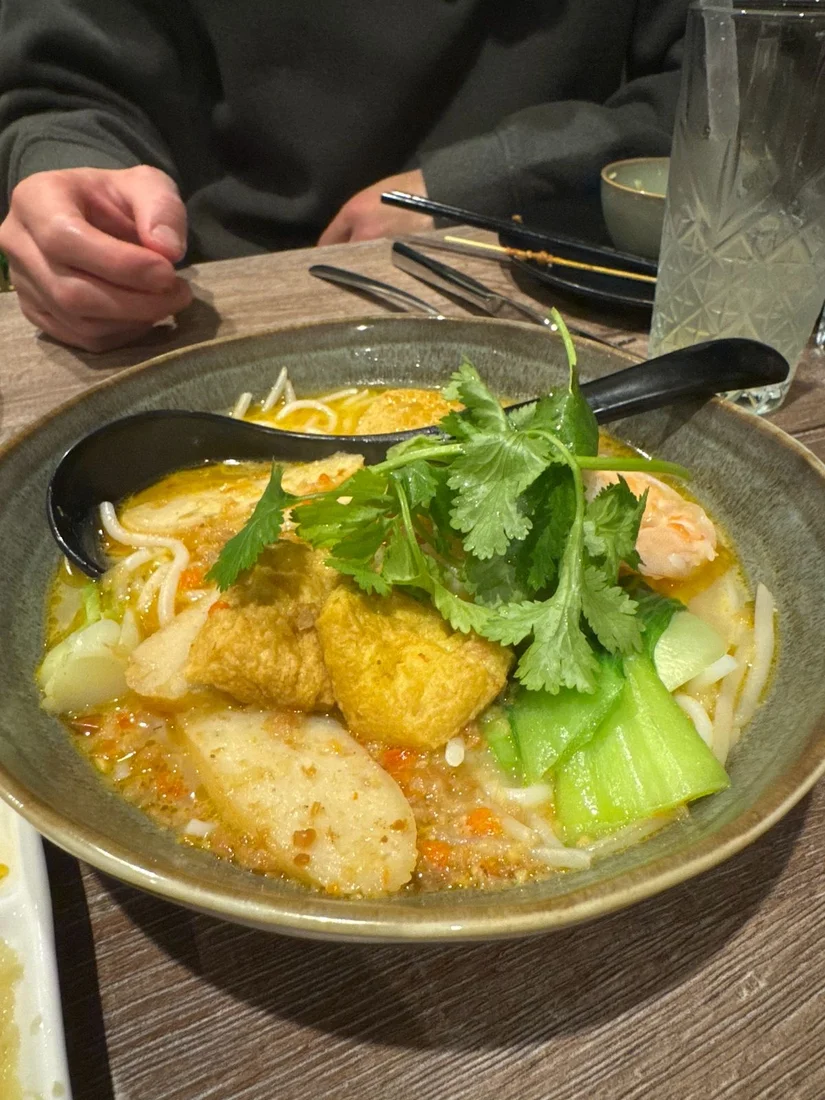 Als klap op de vuurpijl verschijnt er nog een grote kom met dampende laksa. De rijkgevulde, kruidige soep met fishcakes en schaaldieren, is op zo’n koude dag erg welkom.