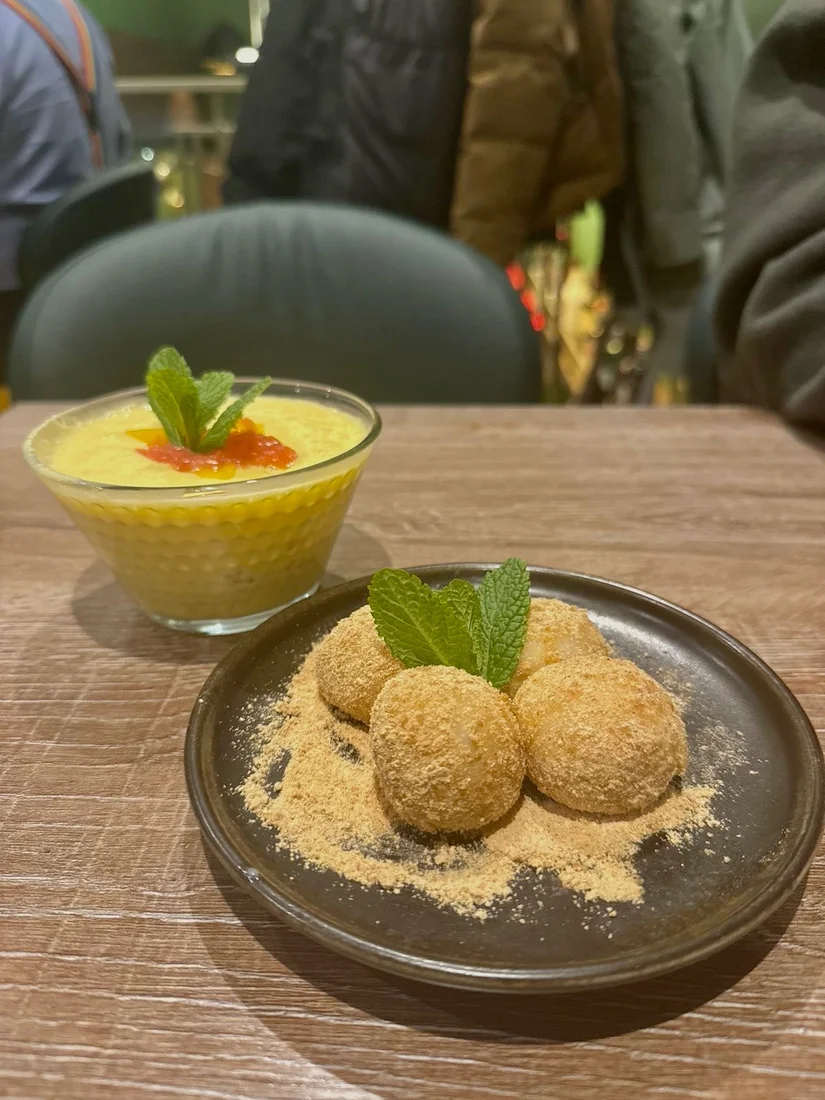 Op het menu staan twee desserts en die slaan we natuurlijk niet over. De mango sago is fris en romig: een dessert van zoete mango, kokosmelk en kleine parels van sago. De tang yuan bestaat uit zachte, kleverige rijst balletjes gevuld met zwarte sesampasta.