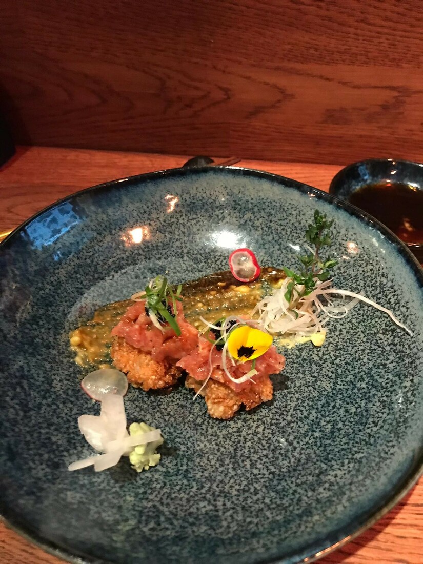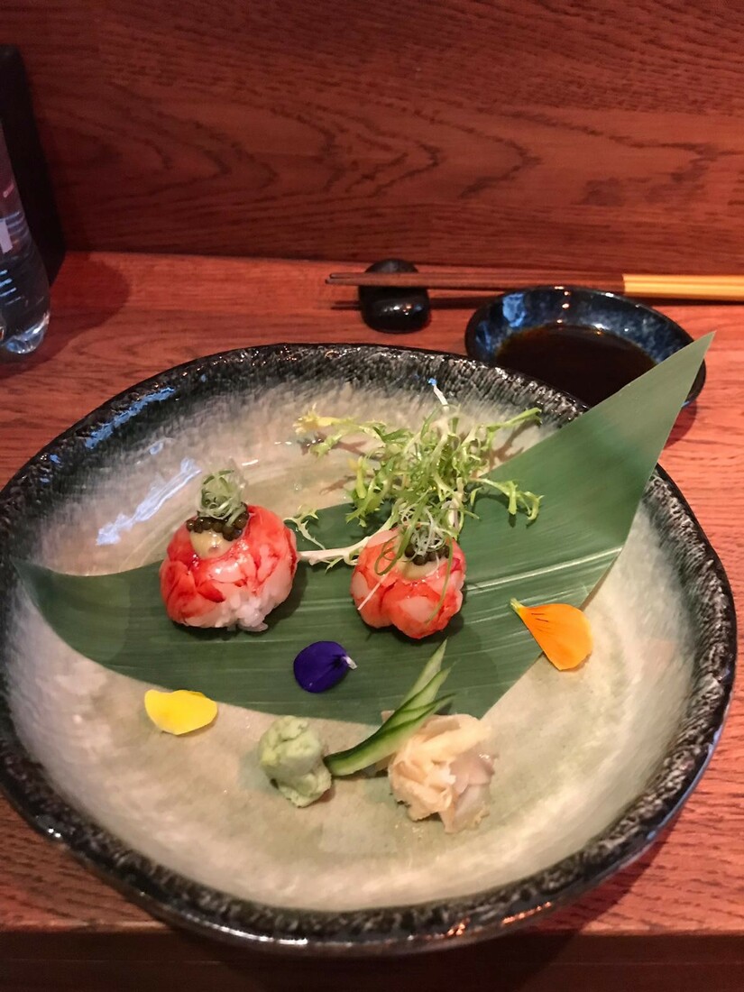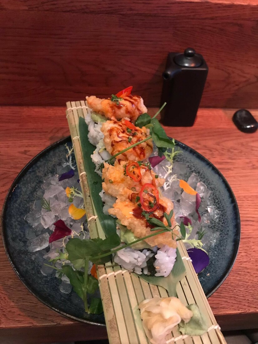 De mensen die naast ons aan de bar zitten, spreken hardop lovende woorden uit. Het is volgens hen “de beste sushi die ze ooit hebben gehad”. Dit schept hoge verwachtingen, die vervolgens ook worden waargemaakt. De twee soorten sushirolls die we krijgen, horen absoluut in het rijtje van ‘beste sushigerechten’ thuis. De eerste sushiroll is gevuld met krab en erbovenop ligt een coquille met truffel en zwarte viskuit. Vervolgens wordt een van de populairste gerechten van Kyatcha geserveerd: de shrimp tempura. Deze bestaat uit een zoetzure avocadosalsa en een tempura gamba bovenop de California maki gevuld met avocado, krab, komkommer en spicy mayonaise. Allebei de sushirolls zijn overheerlijk.