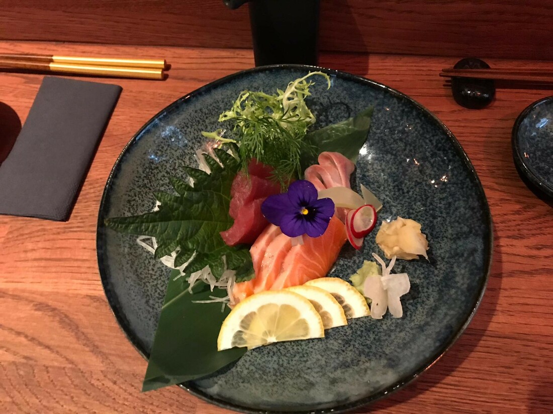 We nemen plaats aan de Japans versierde bar met uitzicht op de keuken. Hierdoor kunnen we goed zien hoe de gerechten - of beter gezegd: de kunstwerkjes - worden bereid. Wat direct opvalt zijn de (snij)vaardigheden van de koks, evenals de zorgvuldigheid en precisie waarmee de aardewerk bordjes worden opgemaakt. Alle gerechtjes worden versierd met kleurrijke viooltjes.