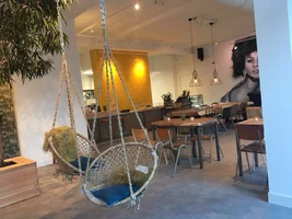 De gezonde zaak bevindt zich op het Gelderseplein, op het rijtje bij Noah en Restaurant Mooii. Het pand stond hiervoor een flinke tijd leeg. Als je binnenkomt loop je direct tegen een grote muurschildering op van een vrouw met klimop als haar. Daan: “Wij zijn hier denk ik de eerste mee. Het is geïnspireerd op street art. Die kunstenaars zien een boom of struik en creëren dat tot kunst. Wij hebben het andersom gedaan.” Het is een groot, licht pand met pasteltinten en de rustige muziek op de achtergrond maakt het een ideale plek om bijvoorbeeld te flexwerken. Er is genoeg keus in zitplekken: op een van de banken, op de schommels, aan een klein tafeltje of aan de grote leestafel, die vol ligt met foodmagazines. Daan: “De inrichting is vooral door Lot gedaan. De meeste spullen hebben wij gewoon van het internet en Marktplaats gehaald.” Dat zou je niet zeggen, want de zaak oogt echt als een geheel. Dat je hier midden in de stad zit vergeet je even in de rust en met al het groen om je heen. Zo staan er overal vrolijke cactussen en staat bij de ingang van de zaak een boom die aangeeft waar de wc’s zijn: ‘pee behind the tree’.
