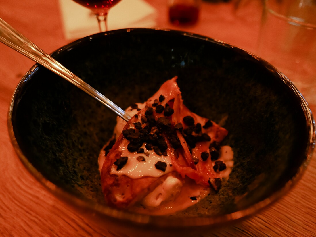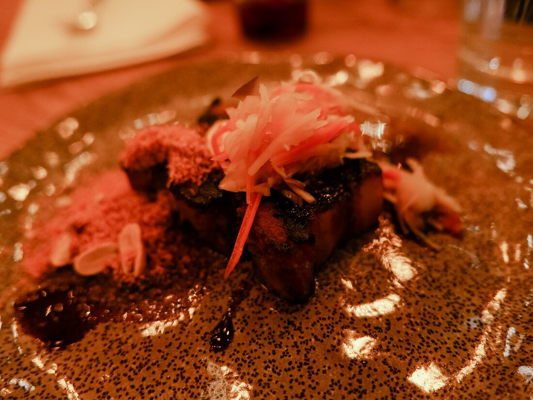 Tot onze verbazing wordt ons een gewurztraminer ingeschonken. De Meatcave doet niet aan opbouw, laten we ons bij navraag vertellen. Er wordt enkel naar het gerecht gekeken en wat het nodig heeft. In dit geval een zoete witte uit de Elzas. Hij begeleidt een van de hoogtepunten van de avond: langzaam gegaard buikspek van de Duke of Berkshire, op Indonesische wijze geserveerd met ketjap benteng, ketjap manis, steranijs en sriracha. Boterzachte buikspek, rijke, pittige smaken en een uitstekende huisgemaakte seroendeng die een aparte vermelding verdient. Hier komen we voor terug, op voorwaarde dat we ‘m dan weer met die gewurztraminer krijgen.