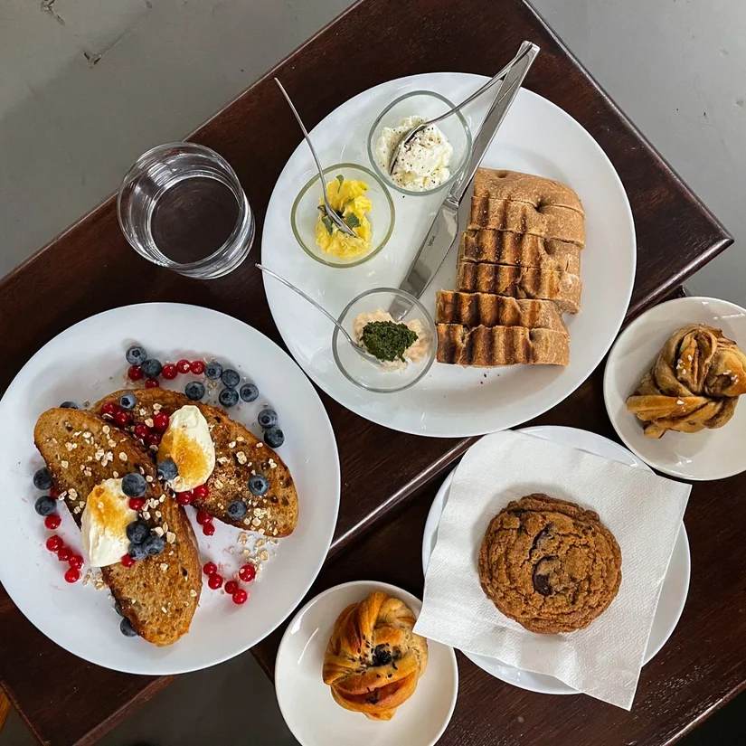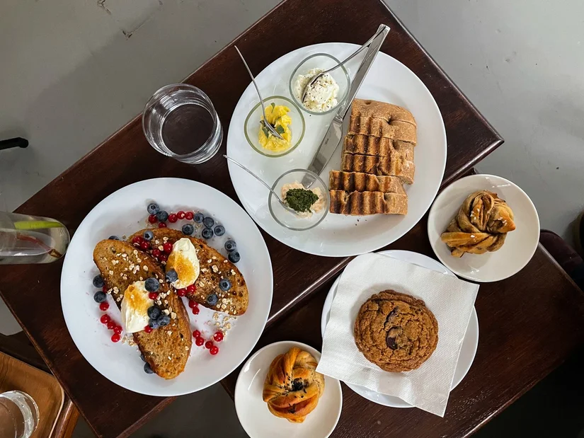 Naast koffie en matcha, kwamen wij natuurlijk ook om wat te eten. We kozen voor een proeverij van focaccia met verschillende dipjes, waarbij vooral de romige zeezoutboter en feta verdraaid goed waren. Ook de french toast met vanillecrème en vers fruit viel in de smaak, deze was goed in balans en niet overdreven zoet.