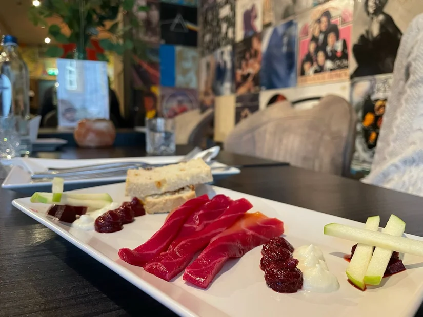 Daarna kregen we een proeverij die de chef had samengesteld, gebaseerd op het dinermenu. Deze bestond uit verse zalm, met rode biet en frisse appelstukjes; ideaal na de toch wel zwaar vallende gerechten hiervoor.