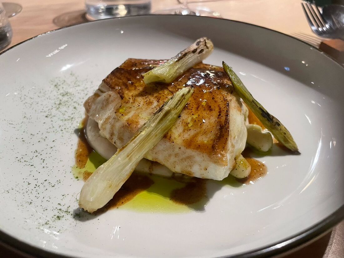 Hij kookt krachtig van smaak en laat de witte peulvruchten bij de vis op de voorgrond staan. De begeleidende garnacha El Hombre Bala, compleet met een superman op het etiket, smaakt zijdezacht, Bourgondisch bijna. Een treffend staaltje teamwerk van chef en sommeliers.