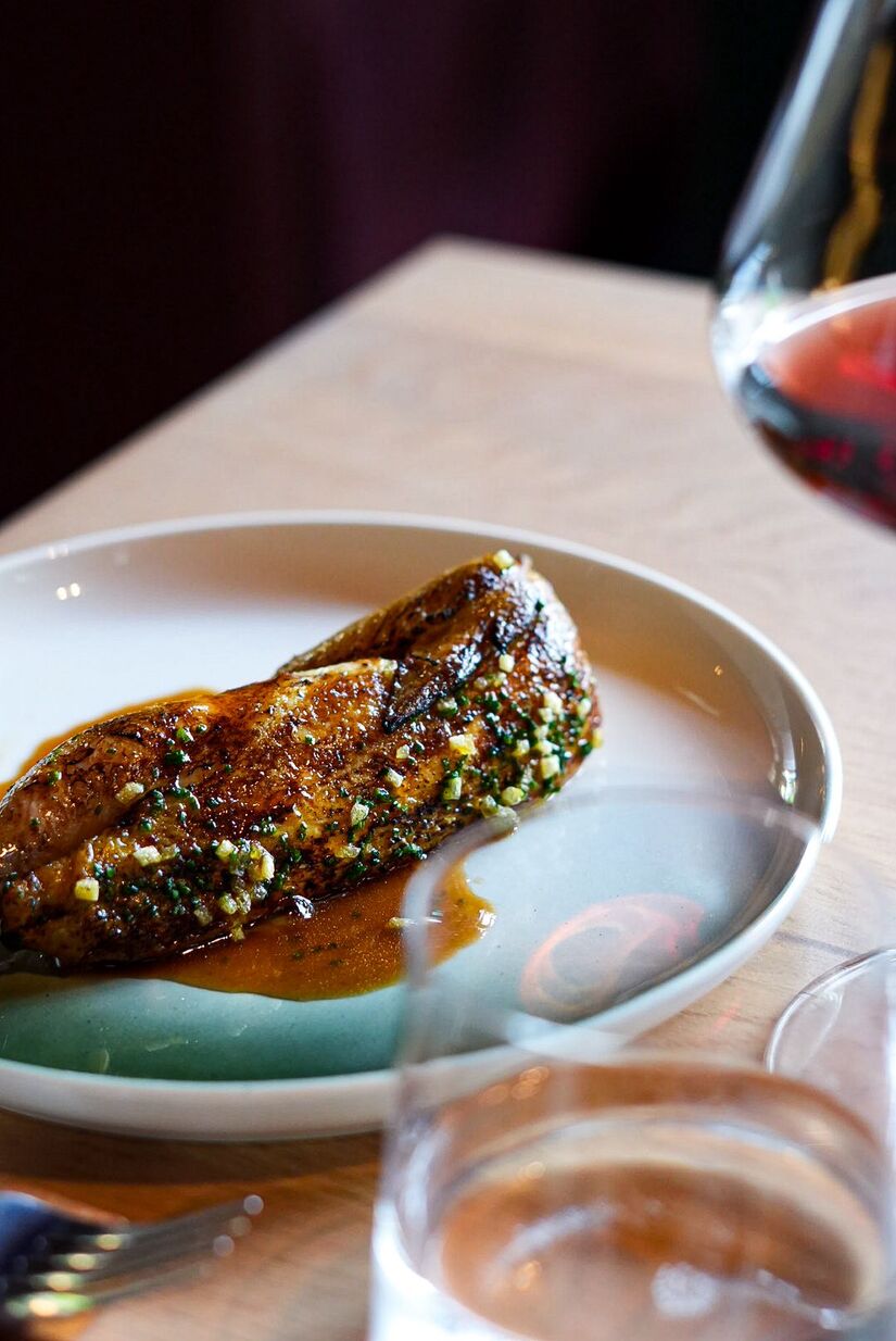 “Zij kwamen voor groot gastheerschap en dito wijnen, maar wilden ook wel eens een mooi stuk vlees. Dat runderribstuk staat nu samen met een hele poussin onder het vrolijke kopje “perfect om te delen”. Duurzaam? Het is rundvlees, maar wel duurzamer door de herkomst. De côte de boeuf is van het Maas-Rijn-IJssel rund.”