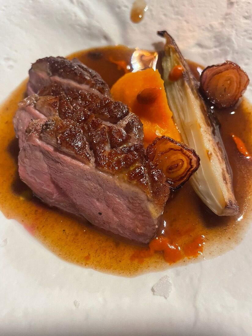 De gekaramelliseerde witlof, pompoen, gel van harissa, chipotle jus halen heel vernuftig de fruitigheid in de wijn naar voren. En de chipotle jus zelf gaat helemaal op. Het huisgemaakte zuurdesembrood van Sanne Traa (inderdaad, de wederhelft van) dep je zonder schaamte in Bjorns chipotle jus.