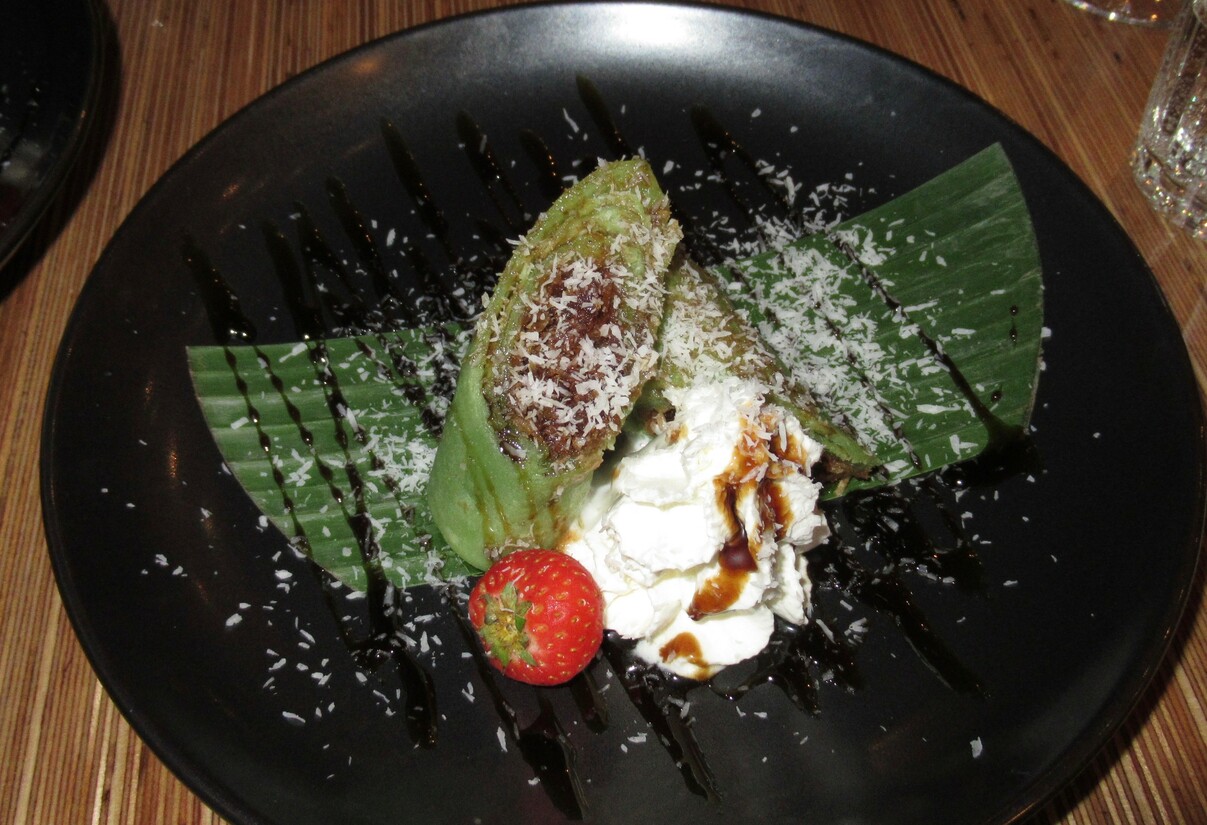 Voor het dessert nemen we een enkeltje Indonesië. We waren al gewaarschuwd: de pannenkoekjes van Nooch zijn hemels. Dus nemen we verwachtingsvol de dadar gulung (pandan pannenkoek met kokos), met daarbij ook nog wat lapis legit (spekkoek met vanille-ijs). En ja hoor, wederom een voltreffer. Vooral de pannenkoekjes zijn om te smullen. Vast niet zo goed voor de bikinibody, maar daar denken we morgen wel weer aan.
