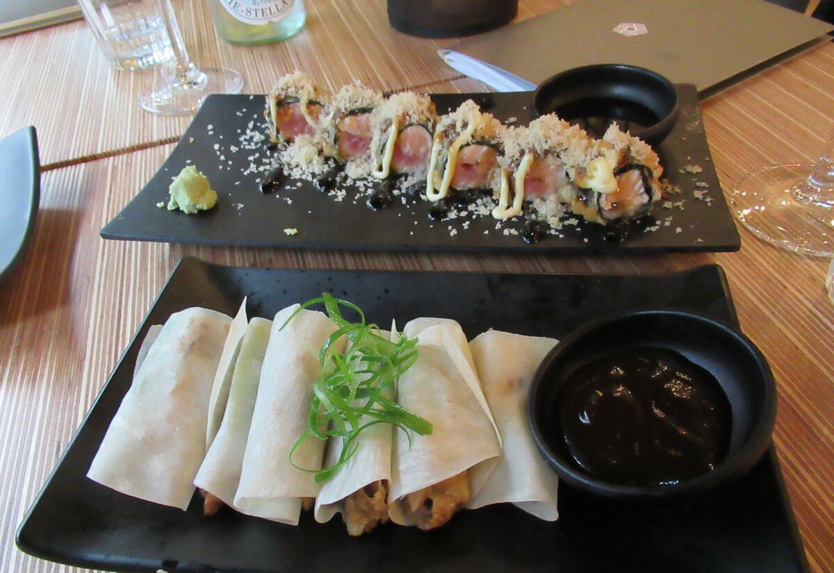 We starten met wat ‘bites’. Op aanraden van de bediening nemen we sowieso de Mandarin pancakes, oftewel pekingeend. Zoals gebruikelijk met komkommer, lente-ui en hoisinsaus, wel heerlijk dat we hier niet zelf hoeven te rollen. Gemak dient de mens. Er zit hier en daar wat veel vet en kraakbeen aan het vlees, verder een verrukkelijke start. Net als de crispy salmon tuna sushi, waar we ook goede verhalen over hoorden. En inderdaad, helemaal niets op aan te merken.