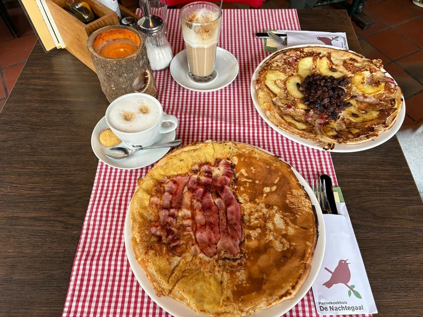 We bestellen een pannenkoek met spek, appel en extra rozijnen en een zogenoemde Duo pannenkoek: één helft met kaas en ham, de andere met appel en kaneel. Op de menukaart staat achter dit gerecht 'met dank aan Ria'. Een vaste bezoeker, blijkt bij navraag. 'Ria hebben we daarna nooit meer gezien. Maar het was wel een goed idee', zegt de serveerster voordat ze wegloopt. Het scheelt ons in ieder geval keuzestress.