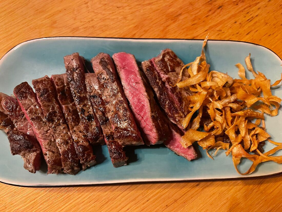 Het item op het menu dat als eerste de aandacht trekt is de risottobal, een echte crowd pleaser volgens Sander. Die mag natuurlijk niet ontbreken bij de bestelling. We vullen ‘m aan met tonijn tataki en gegrilde asperges. De risottobal stelt niet teleur. De combinatie van zachte mozzarellaslierten, kruidige tomatenrisotto en het knapperige korstje maakt het de ideale snack. Een goede start, maar de tonijn tataki steelt deze ronde de show. Niet alleen wordt het gerecht prachtig gepresenteerd, het is ook nog eens een echte smaakexplosie in je mond. De friszure ponzu complementeert de zachte tonijn en de mango zorgt voor een zoete noot. In ronde twee komen er wat zwaardere gerechtjes op tafel, waaronder een andere favoriet van Sander: de entrecote van MRIJ. Het vlees van de entrecote komt van slager Nice to Meat, een begrip in de horecawereld. De steak is perfect medium gebakken en heeft een klein vetrandje, wat zorgt voor een volle smaak. Hij wordt geserveerd met slechts een beetje zout, zodat alle aandacht naar het sappige vlees gaat.