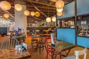 Lunchen in een boekwinkel? Ja, op de eerste verdieping van de boekenwinkel bevindt zich nu Diner @ Donner, een plek waar je kunt neerstrijken om (met een boekje) lekker te lunchen. De inrichting bestaat uit allerlei verschillende, niet bij elkaar passende tafels en stoeltjes die van her en der komen. Gezellig.