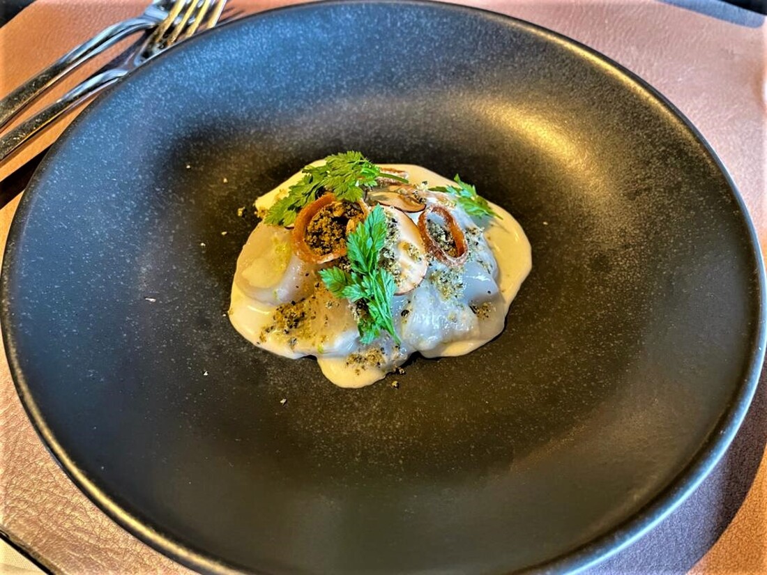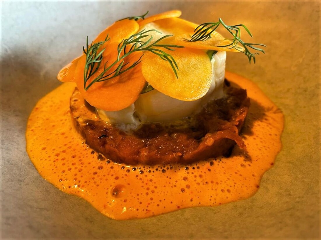 Ellen heeft ons inmiddels voorzien van een glas Pinot Grigio, wat water en een rustiek, vers afgebakken broodje met roomboter. Tijd om Tim zijn kookstijl aan den lijve te ondervinden. We vangen aan met een mousse van champignon, getrancheerde coquille, rauwe champignon en een vinaigrette van gekarameliseerde ui. Het is een lichte, harmonieuze start van onze lunch. Het opvolgende gerecht knalt meer: de pulled pompoen is vlezig en complimenteert de saus van pompoen en rode curry. Deze geeft net een klein prikkeltje op het tandvlees en heeft de juiste pit, zodat hij de kabeljauw die erbij wordt geserveerd niet overheerst. De vis is door Tim langzaam gegaard op de passe (doorgeefluik met hittelampen), waardoor hij net op het randje van gaar zit en het mes erdoorheen glijdt. Wat worden we hier blij van zeg!
