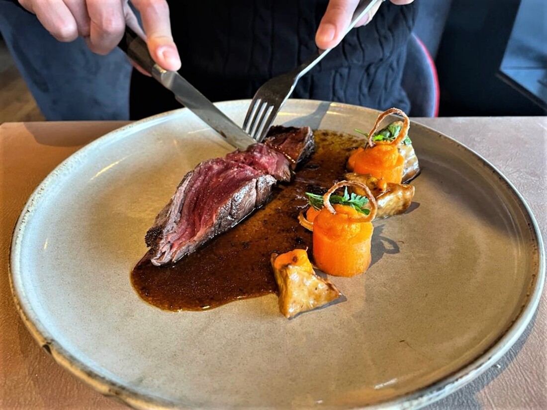 Tim serveert de volgende gang uit, een bavette die gedroogd is: "Doordat we het vlees een dag laten drogen in de koeling, worden de smaken een stuk geconcentreerder. We serveren er een jus bij van zelfgemaakt XO saus, en verschillende bereidingen van wortel en knolselderij." Het vlees is erg mals en ondanks dat dat het hoofdingrediënt op het bord is, zijn we ook erg blij met de wortel en knolselderij. Ook hier valt op dat het geheel niet te zwaar is en het de producten in hun waarde laat. We sluiten af met gekarameliseerde banaan en koffie met een room van Baileys en vanille-ijs. Goed voor de zoetekauw, maar we concluderen samen met Tim dat er iets meer structuur in het gerecht mag zitten, zodat het geen smeuïge soep wordt zodra het ijs wat smelt.