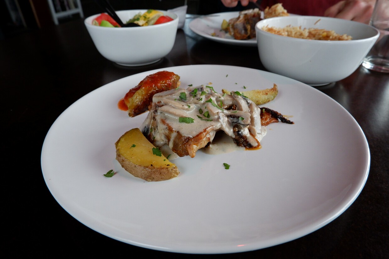 Allereerst wordt Börek geserveerd met brood, enkele spreads en een kleine salade, een goed begin van de maaltijd. Het lamsvlees wat we hierna krijgen is zeer overtuigend. Het vlees is dusdanig mals dat kauwen amper nodig is. Gecombineerd met een smaakvolle champignonsaus en rijst is het een heerlijk geheel. Bij het vlees wordt er ook een vegetarisch gerecht geserveerd. Dit weekend is dat een gevulde paprika. Deze is erg lekker gekruid en zou ook zeker niet misstaan als hoofdgerecht. Het dessert bestaat uit een zoete cake geserveerd met wat zure rode bessen en zorgt samen met een kopje Turkse thee voor een mooie afsluiter.