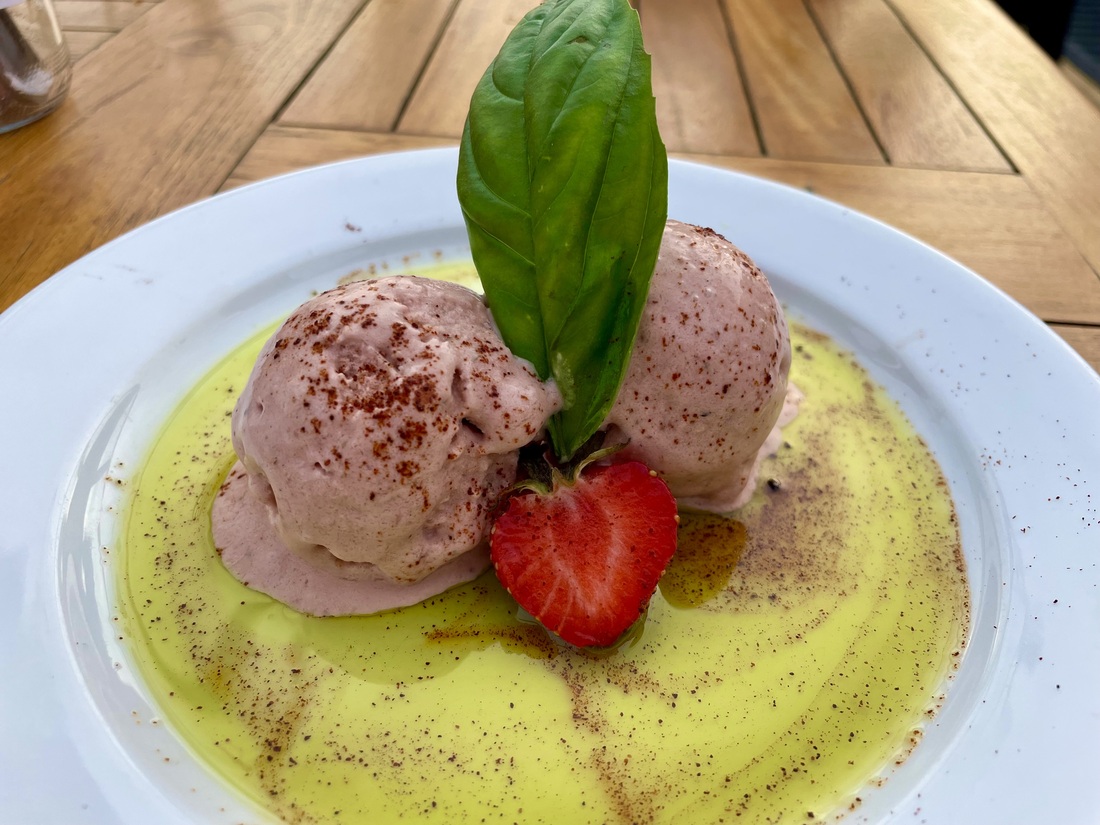 Maar ook voor een beetje experimenteren zijn ze hier ook niet bang. Als dessert krijgen we aardbeienijs met chili, geserveerd op een laagje olijfolie. Een pittige afsluiter van deze mooie avond.