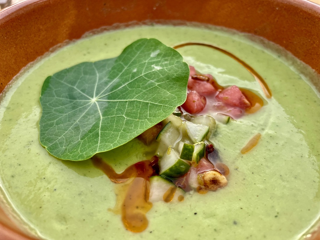 Het eten dat we geserveerd krijgen is allemaal plantbased. We beginnen met een aguachile, wat een koude soep van avocado en komkommer is met bovenop een frisse ceviche van watermeloen. Een verrassende combinatie, met een pittig randje en een subtiele smaak van koriander.