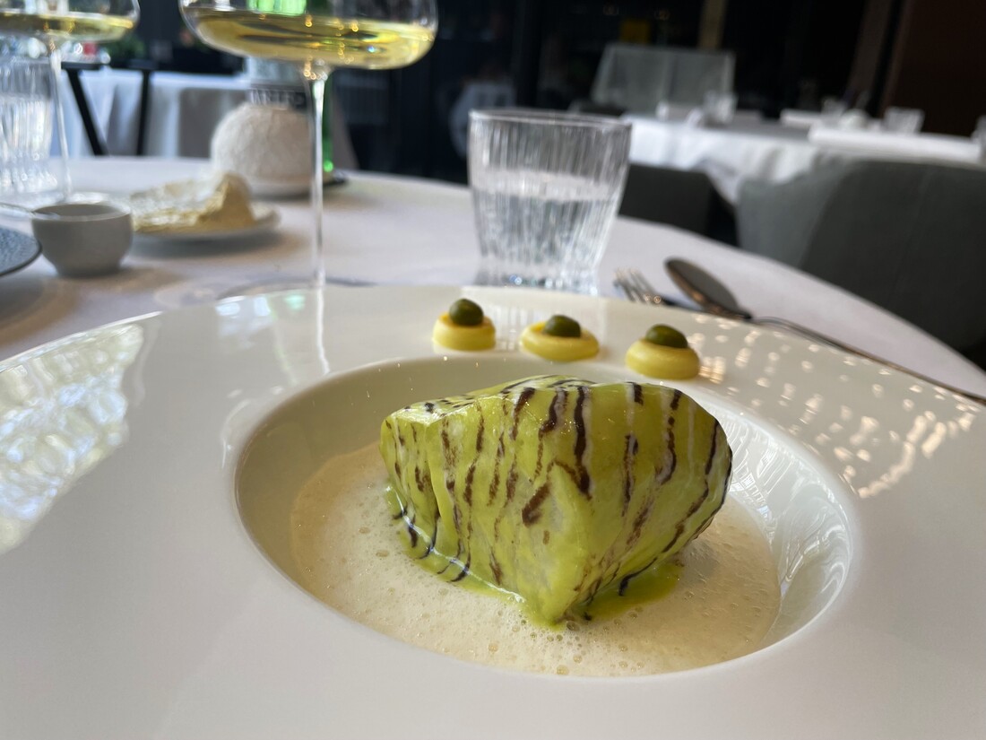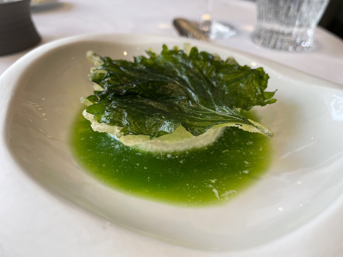 Na de bites en amuses volgen nog ware kunstwerkjes. Noordzeekrab met shiso in tempura en Granny Smith, daarna koolrabi met schapenkaas en als hoofdgerecht kabeljauw met gemarmerde Hollandaise van groene kruiden. Van het gebruik van Japanse technieken, zoals voor de geschaafde en ingerolde koolrabi, tot de combinatie met Japanse ingrediënten zoals miso, shiso, yuzu en sambai: Jan en zijn team laten culturen samensmelten en vinden harmonie.