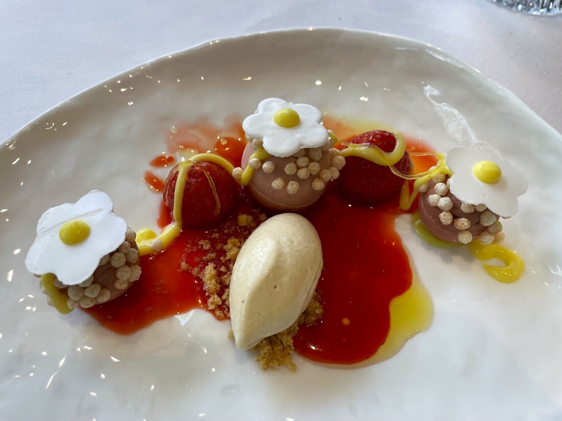 We sluiten af met een dessert van aardbei, yuzu ganache, miso-sorbet en sap van aardbei met olijfolie. De vrolijke kleuren en opmaak met bloemetjes van suikerwerk doen denken aan een van Japans bekendste exportproducten Hello Kitty. Bij de koffie friandises met de in het hoger segment welbekende madeleines en bonbons. Kenmerkend voor Amarone* en passend bij het concept zijn de mochi.