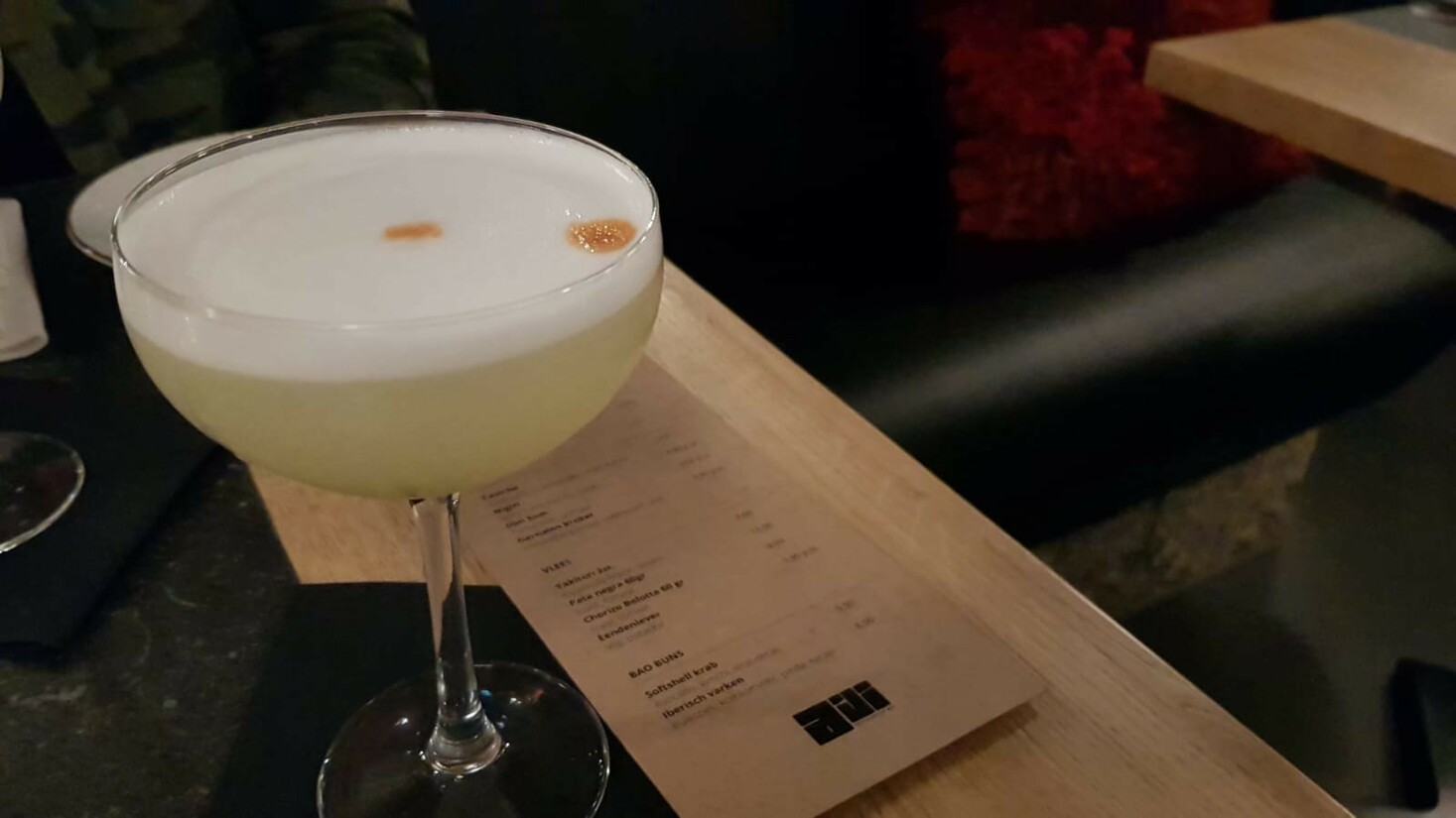 We beginnen de avond met een cocktail. Om precies te zijn met een Pisco Sour, wat je de nationale cocktail van Peru zou kunnen noemen. Hij wordt gemaakt van Pisco, limoen en eiwitten. Voor de sportievelingen onder ons: het is dus eigenlijk een soort Peruaanse, alcoholische eiwitshake. Soort van. Nou ja, slaat eigenlijk helemaal nergens op, maar hij is wel heel lekker.