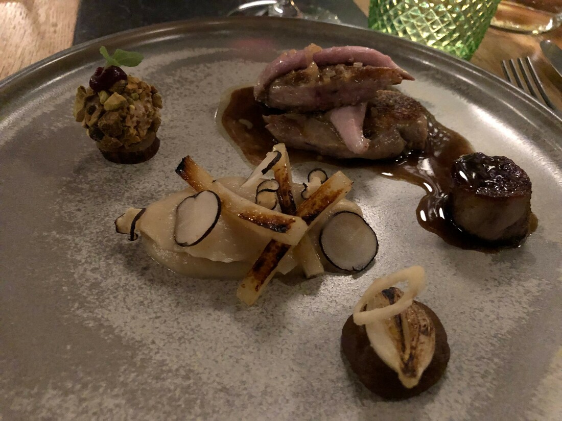 Het laatste gerecht wat we krijgen bevat, net als bij het gerecht van zeebaars, een uitstapje naar de Franse keuken: kwartel met een saus van tonkabonen, ui, schorseneer en ganzenlever met pistache. Naast het feit dat het hele gerecht en in het bijzonder de kwartel, zoals ze op straat zeggen; “kapot lekker” is, blijf ik pistache bij ganzenlever gewoon geniaal vinden. Ook bij dit gerecht gaat het qua smaken alle kanten op. Sowieso komt dit in alle gerechten vanavond wel terug. Telkens vind je wel iets zoets, iets zouts, iets pittigs en iets zuurs.