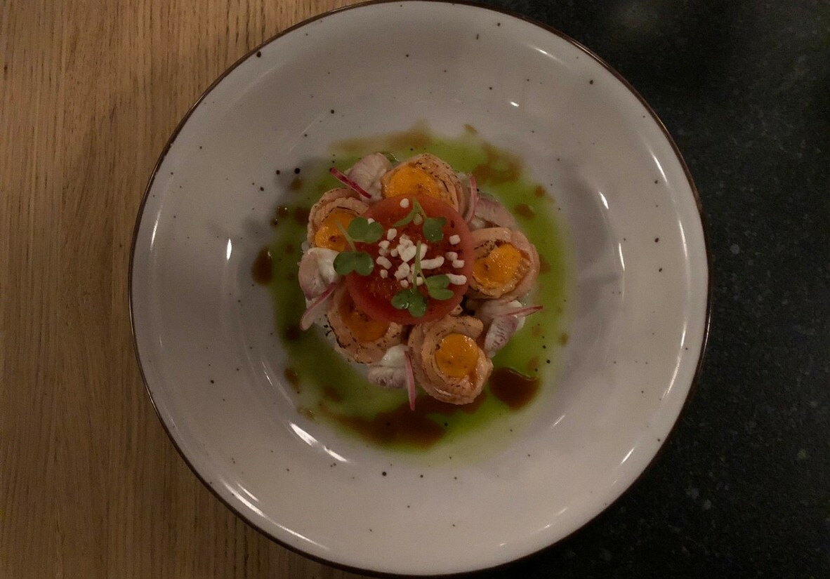 Restaurant Aji – wat je uitspreekt als Ágie - is vernoemd naar de Aji (joh!?), een bes-achtige chilipeper die veel wordt gebruikt in de Zuid-Amerikaanse keuken. Mooi verhaal, maar het ontstaan van restaurant Aji is ook al een mooi verhaal op zich. Chef Pelle Swinkels werkte als sous-chef bij sterrenrestaurant Joelia. Eigenaar Mario Ridder zag wel wat in zijn sous-chef, die hem regelmatig verraste met bijzondere smaken. Om een lang verhaal kort te maken; Mario wilde Pelle verder helpen op culinair vlak en bij het ondernemen en ze bedachten samen het concept voor Restaurant Aji. Klassiek meester-helpt-leerling-verhaal of niet?