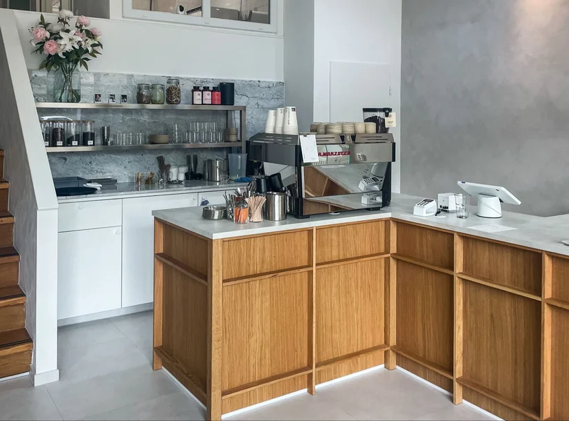 Van binnen is het minimalistisch ingericht en daardoor valt de inhoud van de vitrine in een extra mooi daglicht. Wat meteen opvalt, is dat dit een plek is waar mensen echt komen om met elkaar te verbinden. Geen laptops en telefoons in zicht, maar echt tijd en aandacht voor elkaar.