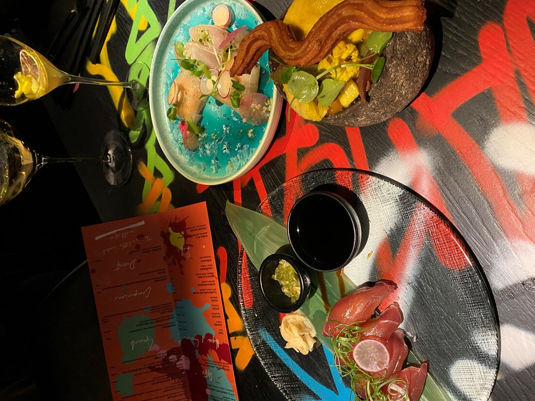 We nemen plaats midden in de zaak aan de artistieke tafels vol graffiti en nemen de nieuwe kaart door. Veel sushi en kleine gerechten, to share or not to share. Als appetizer gaan we voor de guacamole. Deze wordt op tafel voor klaargemaakt. Met het entertainment aan tafel zit het dus ook wel goed. Voor de tweede ronde kiezen we voor verse tonijn sushi, hartige churros, pakketjes van hamachi en kingcrab en kippendijen van de Josper grill. De sushi is super vers, de kippendijen heerlijk mals en de vis pakketjes zijn een smaak explosie in de mond. Maar, waar we nog meer van smullen zijn de hartige churros. Eigenlijk is het een goede tartaar met daarbij churrus. Op de bodem een goede portie tartaar van MRIJ rund, ingelegde groenten en daar bovenop een smaakvolle creme van eierdooier. Hier bovenop de krokante churros. Dit is zo smaakvol, dat het een ‘not to share’ aanduiding op de menukaart verdient. Alles smaakt ons zo goed dat we voor nog een ronde gaan. Short-rib skewers en tortellini van kreeft. Erg mooi opgemaakt op gouden borden die net zo Instagrammable zijn als het interieur en een mini grill. We snappen al die flitsen van foto’s om ons heen wel. Alles ziet er prachtig uit. De tortellini met kreeftensaus is heerlijk en de ziltige groenten die erbij geserveerd worden geven een extra smaak dimensie. De short rib is super mals en smelt in je mond, een goede balans met het knapperige van de pompoenpitten. Ook dit gerecht kan wat ons betreft onder ‘recommended not to share’.