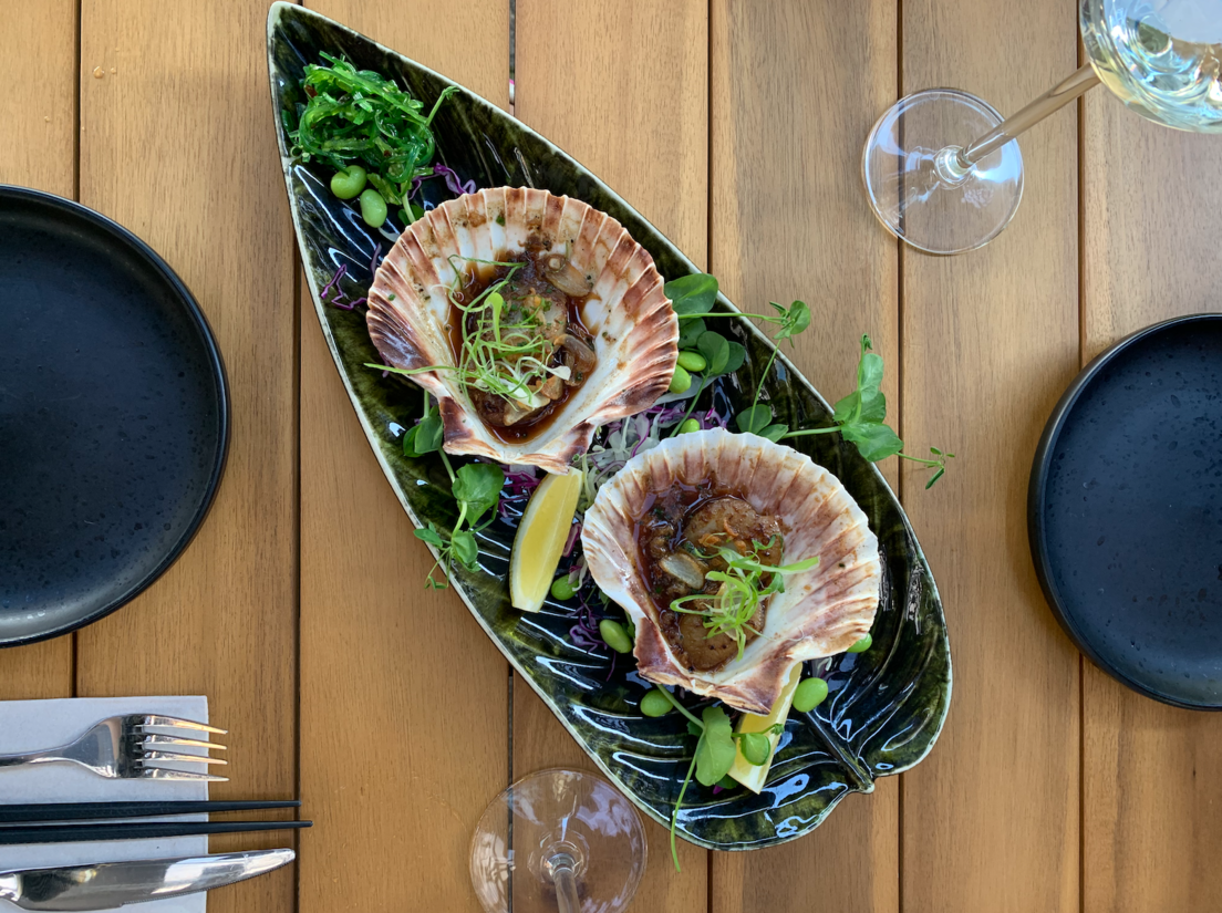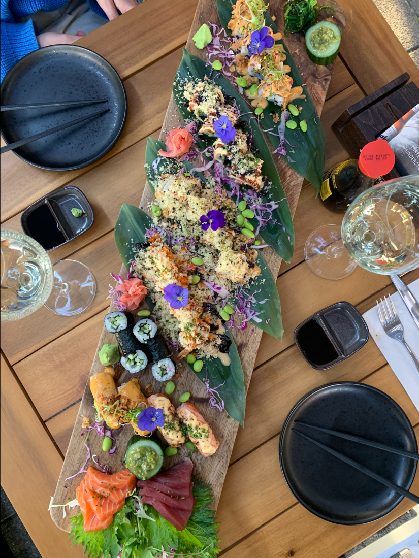 Wat betreft de presentatie van het eten, komt het keukenpersoneel geen kennis tekort. De borden worden chique opgemaakt met bloemetjes, takjes, blaadjes, schelpjes. Overal wordt over nagedacht. We slurpen oesters die worden gegarneerd met limoen en sjalotten in rode wijnazijn en eten coquilles, die de knoflookliefhebber niet moet laten liggen. Dit alles om alvast warm te draaien voor het plateau met sushi dat ons te wachten staat.