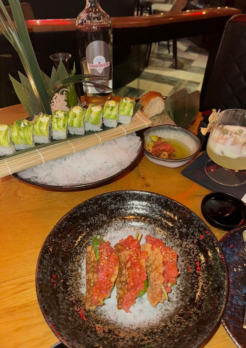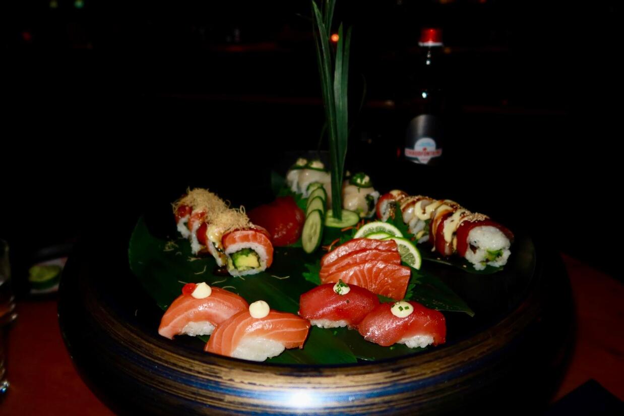 Binnen is het precies die balans die de sfeer bepaalt. Fluwelen banken, intiem sfeerlicht, en een dj-booth die niet alleen ter decoratie is. Met zicht op de open keuken waar sashimi wordt gesneden en de hele ruimte met heerlijke beats en gezellige mensen. Het voelt luxe, maar nooit stijf.