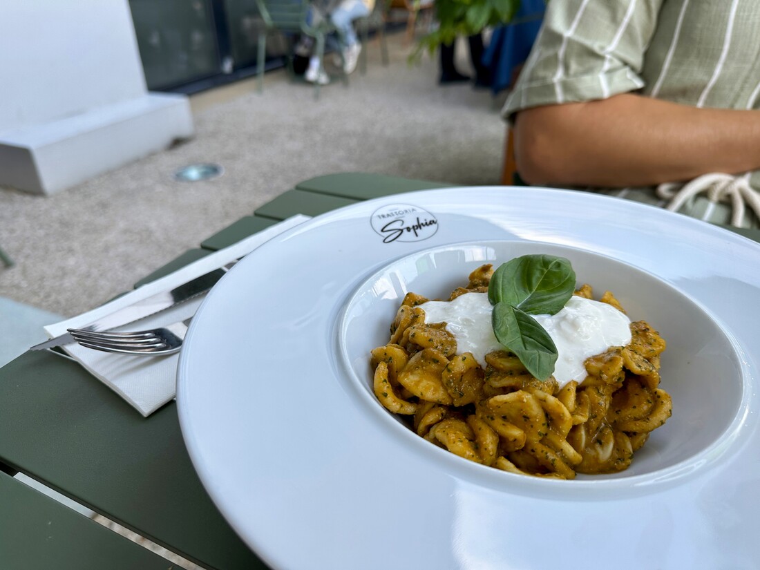 Onze Italiaanse bingokaart maken wij vervolgens compleet met een pasta. Wij eten een orecchiette met pesto van tomaat, gecombineerd met amandelen, basilicum en ook hier weer romige stracciatella kaas. De huisgemaakte pasta is al dente gekookt, heeft een goede bite en krijgt het podium dat het verdient in dit gerecht.