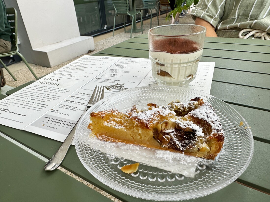 Wij sluiten de avond af met een dolce, namelijk een huisgemaakte tiramisu, geserveerd in een beker. Ook staat er een vijgen-amandeltaart op de dagkaart. Deze taart is belegd met stukjes vijg, is van buiten erg knapperig en doet denken aan boterkoek. Met de laatste hap eindigen wij met een voldaan gevoel onze reis door de Italiaanse keuken. Sophia heeft wederom de tijdloze aantrekkingskracht van la cucina Italiana bewezen.