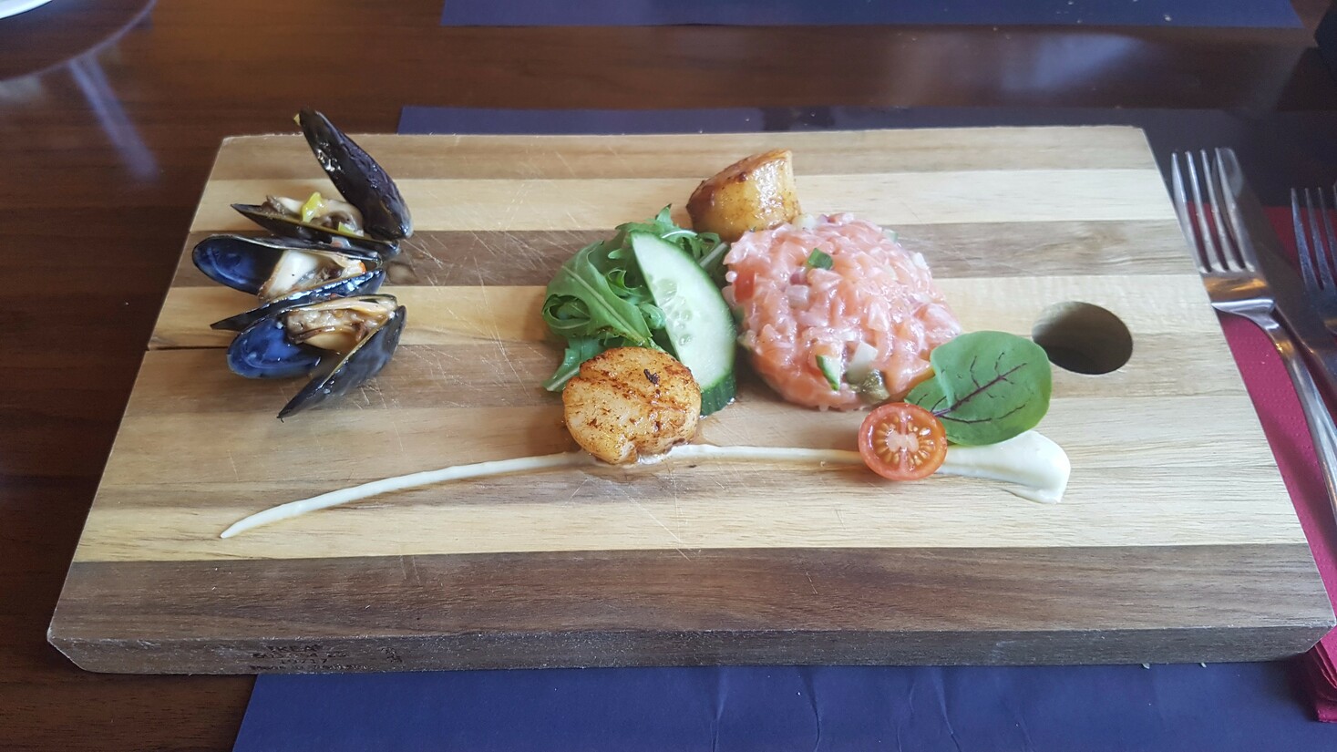 Back to reality, want voorafje nummer twee is in aantocht. Een plank gedecoreerd met zalmtartaar, coquilles en een paar mossels. De tartaar is vers, fris en smooth as fuck. De coquilles zijn on fleek en de mossels? Ik heb niks met mossels. Maar dit waren geen mossels, dit waren “niet mosselige chilimossels”. Wie hier de normale mossel bestelt doet zichzelf kilometers te kort. Geloof me, ik onderdrijf.