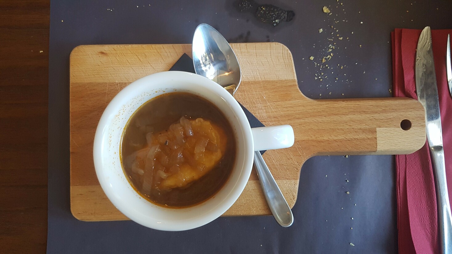 Omdat de voorafjes nog niet op waren, komt er een smaakversterkerloze uiensoep waarvan de uien zoet zijn en de soep doet denken aan de staart van een os. Pittig, zoet en lovely. Wat wil je nog meer dat ik zeg? Niks? Mooi. On to the main course. Barry kent geen genade en slingert ons een nieuwe selectie aan voeding om de oren. Op de huid gebakken zeebaars, biefstuk croma en kalfsribeye met knoflookjus.