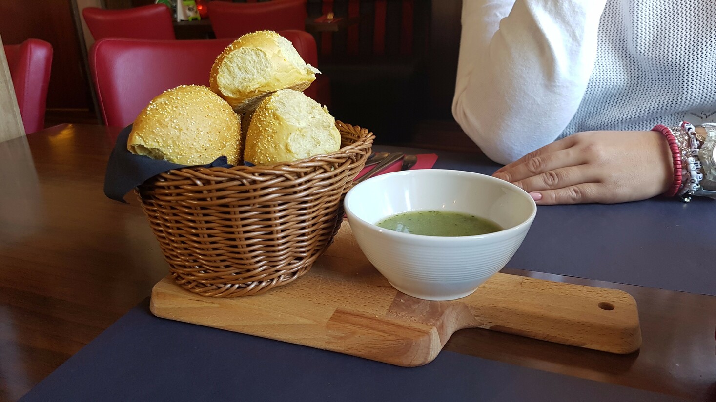 Persoonlijk vind ik pesto stom, veel te sterk van smaak en aanstellerig in vergelijking met kruidenboter. Maar Barry kent mij. De pesto was een mix van perfecte olie, groen pestospul en een vleugje Parmezaanse kaas. Zo lekker dat ik het brood in steeds kleinere stukjes scheurde, omdat er anders niet genoeg magic sauce aan bleef hangen.
