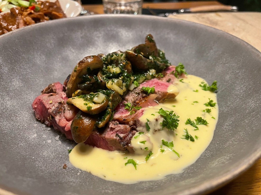 De hoofdgerechten volgen snel hierna. De heerlijke malse ribeye die we krijgen, is favoriet van de avond. De steak wordt geserveerd met een bearnaisesaus en gebakken champignons met groene kruiden. Het vlees wordt medium-rare geserveerd en heeft hierdoor nog een mooie roze kleur die de trek aanwakkert. Ook wordt het gerecht Batagor geserveerd. Dit Indonesische gerecht bestaat uit dumplings, bij UPtown gemaakt met tofu, met pindasaus, lente-ui en rode peper. De verschillende smaken dansen in je mond en ondanks dat het een vegetarisch gerecht betreft, vult het gerecht goed en eten we onze buik rond. Bij het hoofdgerecht serveert gastheer Niels een Pinot Nero uit Veneto, die het goed doet bij zowel de steak als bij de dumplings.