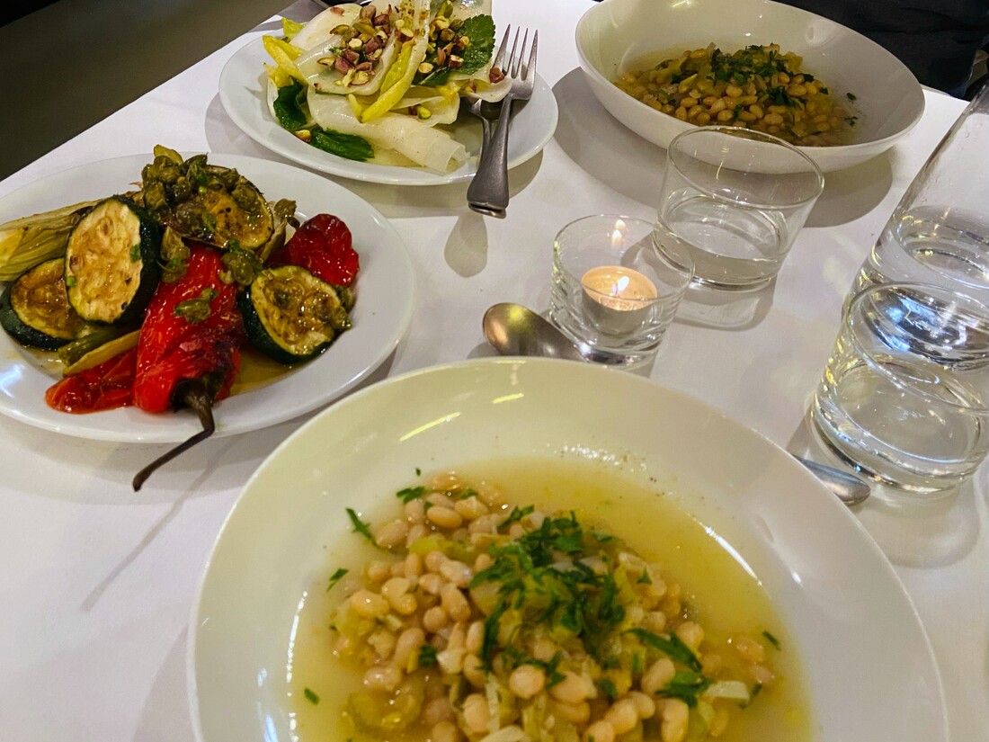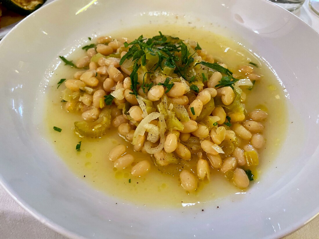 Het hoofdgerecht is een vegetarisch feestmaal, waar de pure smaken van verschillende groenten de show stelen. Het bord is gevuld met een bonenstoof, zachtgegaard in een kruidige groentebouillon, die rijkelijk over het gerecht heen is gesprenkeld. De bouillon is zo lekker, dat we bijna overwegen om een extra kommetje ervan te vragen.