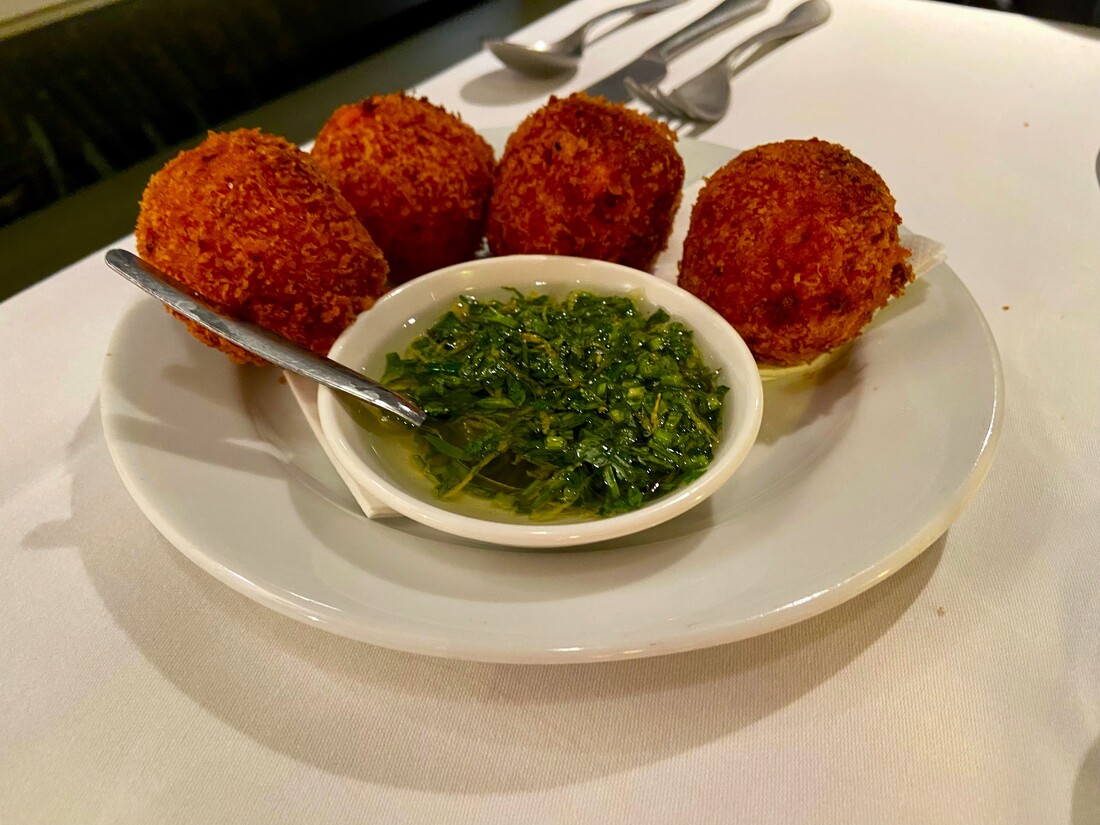 Lang wordt onze nieuwsgierigheid gelukkig niet op de proef gesteld. Na een aperitief met daarbij vers brood en een oreganoboter, wordt de eerste gang van het 3-gangenmenu geserveerd. De populaire risottoballetjes arancini worden op tafel gezet.