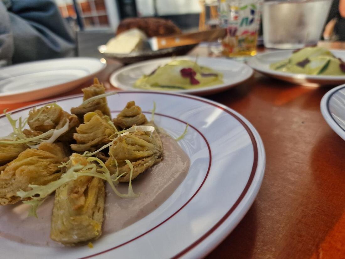 Bij de Kaapse Louise, een vol blond bier, verschijnen de voorgerechten om te delen op tafel. Gefrituurde artisjok met walnootsaus, de klassieker oeuf mayonnaise en rustiek brood met opgeklopte gezouten boter zetten de toon.
